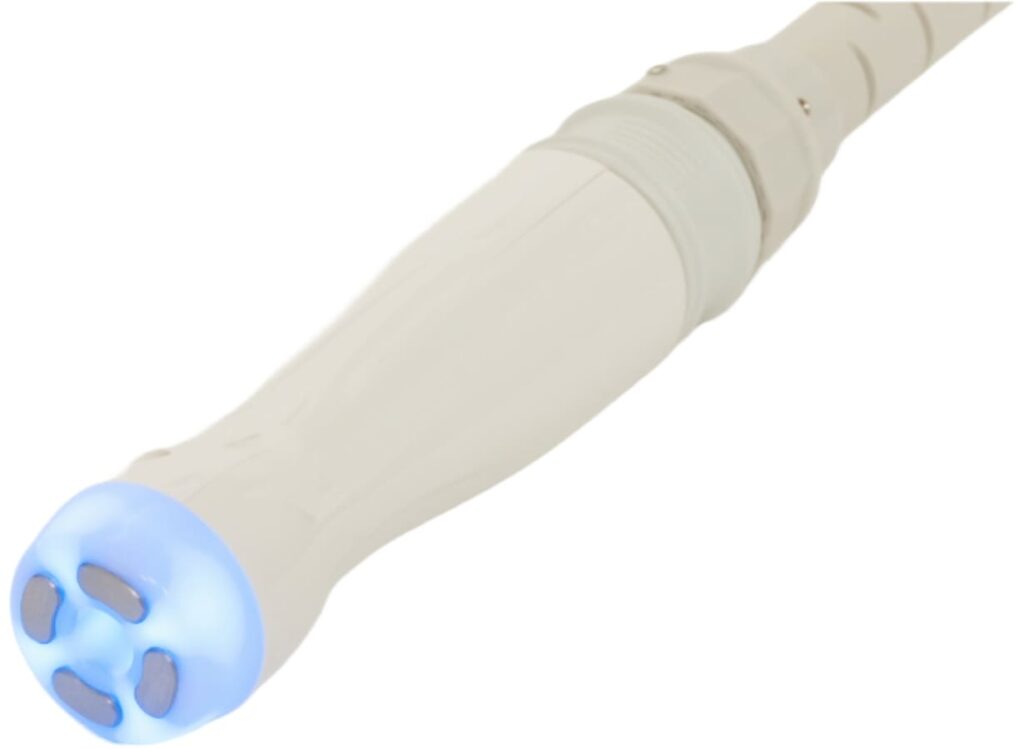 青色LEDで肌にハリ・ツヤを与えます。フェイシャル専用プローブがお顔にフィットするので、施術の難しい目尻などの施術も可能です。