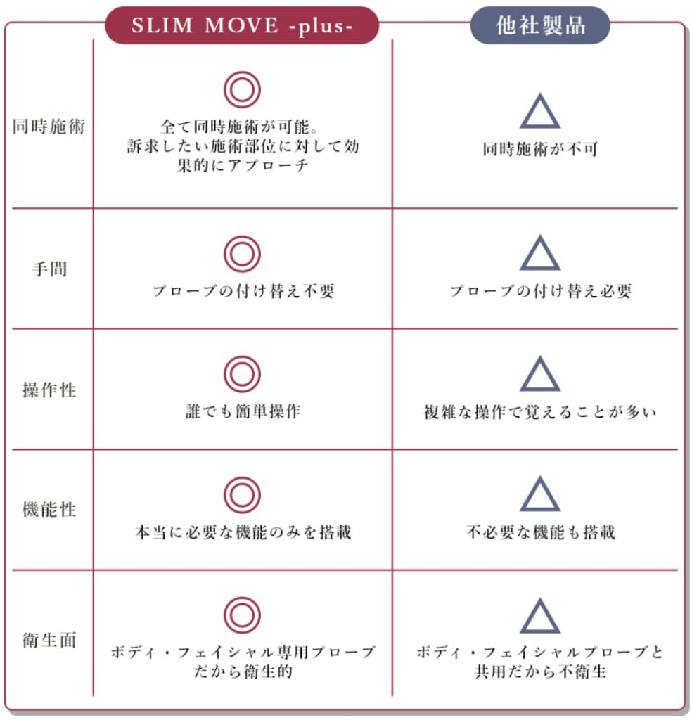 お客様は結果が出ないとリピーターにはなりません。SLIM MOVE plus は、必ず結果を出す自信があります。ぜひ他社製品と比べて圧倒的な違いをご体験ください!